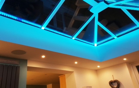 K2 Orangery  roof  with remote controlled led lights set around the bottom of the glazing to give a fantastic effect. When combined with the latest Bose in ceiling speakers it creates a truly breathtaking effect for parties.